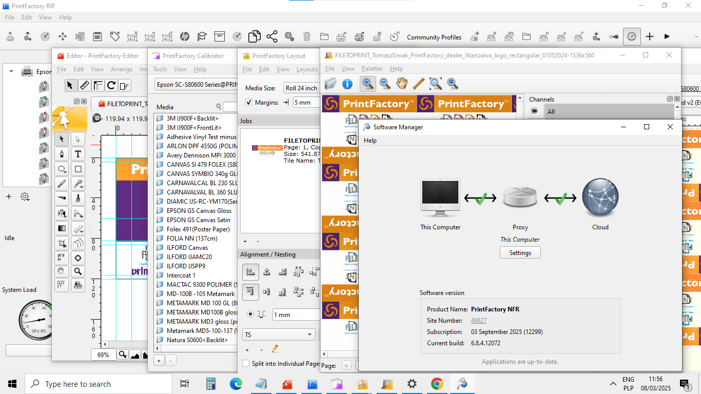 08-03-2025 Screenshot from PrintFactory software in the latest PrintFactory version no. 6.8.4.12072 from 19 January 2025, used by PrintFactory dealer FILE TO PRINT Tomasz Siniak Warsaw Poland. Since 4 March 2025 we are the PrintFactory software dealer with larger sales territory consists of Poland, Austria, Switzerland, Denmark, Sweden, Norway, Finland, Czech, Latvia, Lithuania, Estonia, Croatia, Slovenia, Slovakia, Portugal, Greece, Spain, Romania, Bulgaria, Serbia, Hungary. We speak English and Polish. Contact us by telephone/WhatsApp TEL.+48 513 411 229, +48 515 476 690, and then by e-mail. Copyright by PrintFactory, FILE TO PRINT Tomasz Siniak PrintFactory dealer Warsaw Poland